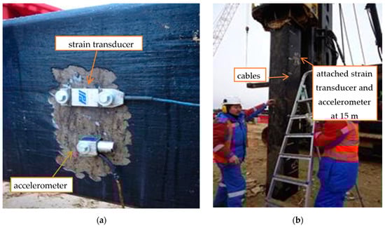 Installation of accelerometers and transducers: (a)—attached accelerometer and transducer on pile; (b)—PDA during the installation of pile.