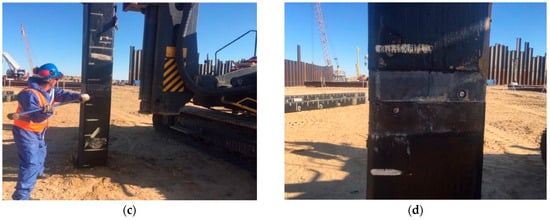 Installation of precast concrete pile: (a)—metal grooves for connection between precast reinforced concrete piles, (b)—alignment process when connecting precast reinforced concrete piles, (c)—installation of a pin at the junction of precast reinforced concrete piles, (d)—completed connection between precast concrete piles.