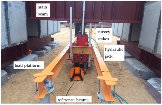 Figure 7) presented itself as a system made of steel, which consists of a metallic beam and two load platforms (total weight of concrete blocks 450 tons) located at equidistant distances from the center main beams. Static load stages are presented in