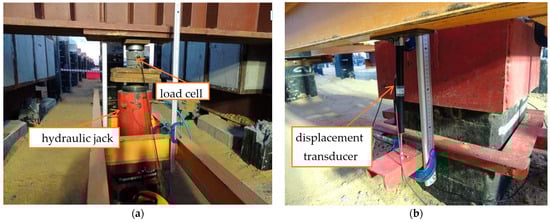 Measurement equipment for static compression load test: (a)—hydraulic jack, load cell; (b)—displacement sensors.