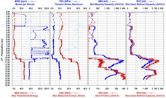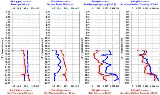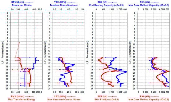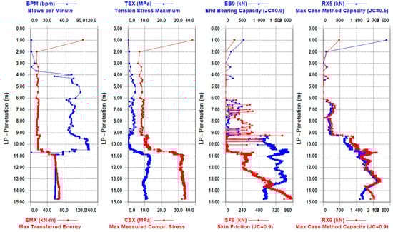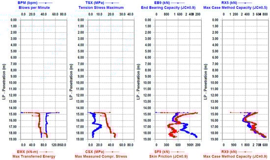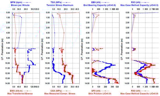 Figure 6). After driving the first part of the joint pile, a pair of accelerometers and strain transducers were attached to the second part of the pile at 8 m. The data from the piles were entered into the program, and the PDA dynamic tests were continued. After the execution of the field part of the dynamic test, selected blow data (often one of the last blows) were analyzed in the computer program Case Method and iCAP