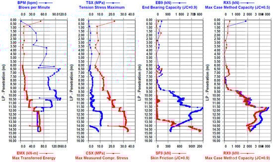 Graphic results of driving precast concrete joint piles using the PDA method, TP-02, from the beginning of driving to a depth of 14.75 m.