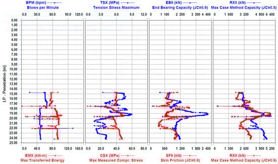 Graphic results of driving precast concrete joint piles using the PDA method, TR-02; depth from 14.75 m to 26.25 m.