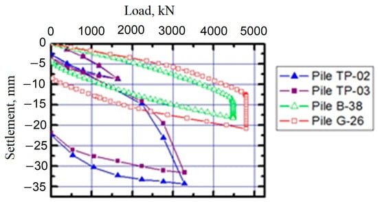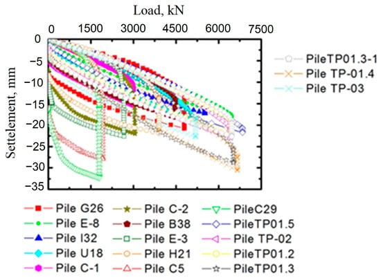 Static compression tests were performed on prefabricated reinforced concrete precast concrete joint piles No. TP-03, No. TP-02, No. TP-01.5, and No. K-3, which are moved under the control of a cargo unloading facility (COF) zone at depths of 23 and 26.75 m, and pre-drilled with an auger with a diameter of 330 mm to a depth of 11.40 m.