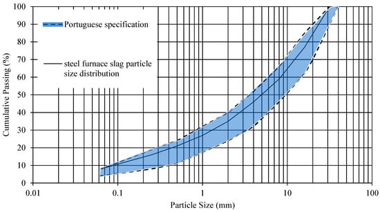 Steel slag particle size distribution within the Portuguese specification limits for sub-ballast [].