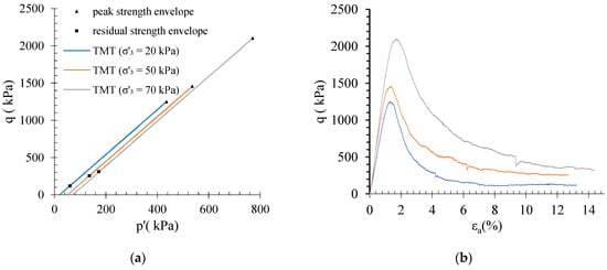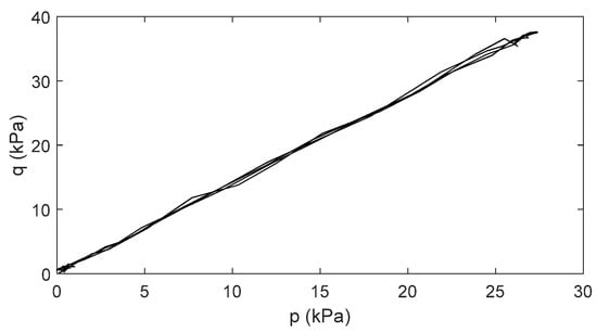 The results of the monotonic triaxial tests are presented in Figure 2, where the stress paths (Figure 2a) are presented in terms of deviatoric stress (q =) and mean effective stress ( =). In Figure 2b, the stress–strain curves in terms of deviatoric stress and axial strain are also presented. The stress–strain curves are typical of dense granular materials with a peak strength followed by a post-peak softening. As expected, the slope of the initial tangents to the stress–strain curves increases with confining pressure because the stiffness increases with effective stress. From the stress paths, the peak strength envelope was obtained, which corresponded to a peak angle of shearing resistance of 64° and a cohesion intercept of 85 kPa. Such a high peak angle, higher than the typical values of conventional sub-ballast materials, is the consequence of the grain size, particle angularity, and particle strength, leading to significant interlocking and dilatancy [,,]. Although granular materials typically present a non-linear strength envelope for a large range of effective stresses []; in this case, a linear envelope for the range of confining stresses analyzed was assumed. For this reason, an artificial cohesion intercept is included, although the materials do not have any cohesion due to the lack of fine particles or cementation.
