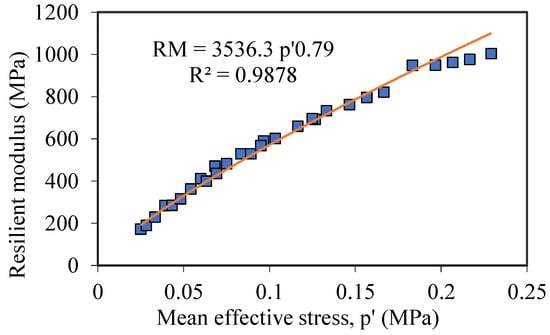 The resilient modulus was calculated for each cycle. Then, for each load level with 100 cycles, an average value was considered in the last 10 load cycles. The evolution of resilient modulus for the different load levels was analyzed by plotting it against the mean effective stress, p’, defined as the average of the principal effective stresses, as shown in Figure 3.