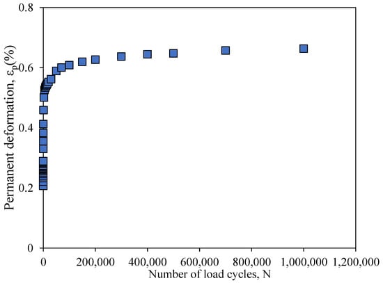 The permanent deformation was analyzed for one million load cycles, greater than what is proposed in EN 13286-7 [], because the steel slag is a man-made material, and the standards were developed for natural materials. The results, illustrated in Figure 4, demonstrate that the material presents a plastic shakedown behavior [], leading to a stabilization of the permanent deformation after 300,000 load cycles.