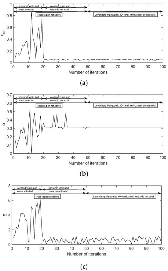 The variation in the parameters εp0, α, and B with the number of simulations is depicted in Figure 5a, Figure 5b and Figure 5c, respectively. As is possible to observe, when the trust–region–reflective method is adopted with defined boundaries (xmin and xmax), the variation in all the parameters is significantly higher. This phenomenon does not occur in the Levenberg–Marquardt method since defining boundaries is not allowed. This means that the outcomes regarding the methods adopted are similar, despite the parameter analysed.