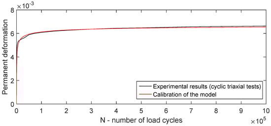 From the cyclic triaxial tests performed at the laboratory, the empirical permanent deformation model described by the expression (1) was calibrated through the determination of the material’s constants (εp0, α, and B). The calibration was performed to find the best fit between the experimental (cyclic triaxial) tests and numerical data (obtained through the empirical permanent deformation model) by the definition of the parameters (εp0, α, and B) (corresponding to the properties of the materials). To do so, it was important to use the initial and final mean and deviatoric stresses considered in the laboratory tests. This calibration was based on the experimental long-term cyclic triaxial tests carried out during one million load cycles (see Table 2). This model is also dependent on the Mohr–Coulomb yielding criterion that depends on the parameters m and s, which are based on the cohesion (c′) and friction angle (ϕ′) of the steel slag.