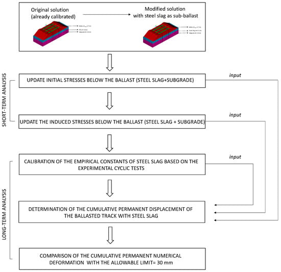 The adopted methodology is described in Figure 10. Thus, a ballasted track model already calibrated (designated as the original solution) was modified, and the natural aggregate layer was replaced by the steel slag with different values regarding the resilient modulus and density.