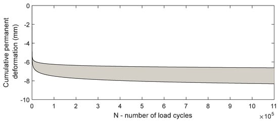 Based on the methodology described in Figure 10, the cumulative permanent displacements of the ballasted track with steel slag were determined, which are depicted in Figure 11. The cumulative, permanent deformation was obtained in the vertical alignment under the load. Since several combinations were simulated, the cumulative permanent displacement corresponds to a range of possible values. The maximum value corresponds to a permanent displacement of 8.3 mm, and the minimum displacement corresponds to 6.6 mm. Thus, these displacements are significantly below the allowable displacement for the ballasted track in high-speed lines, whose limit corresponds to 30 mm. Therefore, the results show that it is possible to include a sustainable and environmentally friendly material in a ballasted track, such as steel slag, to maintain the performance of the track.