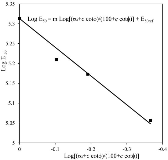 To apply this equation to the triaxial tests, a linearization procedure needs to be performed, and the tests results are plotted in Figure 12 to obtain and m, which, in this case, are 206 MPa and 0.7, respectively.