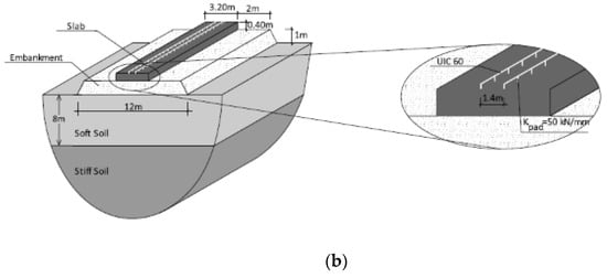 A non-linear numerical model was used to compute the critical speed through a 3D finite element model formulated in the time domain. The examined scenarios, depicted in Figure 14, consist of two types of railway tracks: “standard” slab and ballasted tracks, both positioned over an 8 m-thick layer of soft soil. To comprehensively assess their influence on the critical speed, the scenarios were evaluated under two conditions for the sub-ballast: a layer composed of a traditional natural aggregate; or a layer composed of steel slag.