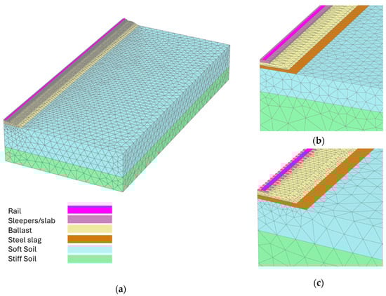 Finite element model: (a) global overview; (b) detailed view of slab track; (c) detailed view of the ballast track.