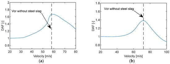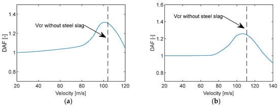 Each railway track was evaluated with and without the presence of the steel slag layer to assess its impact on the critical speed. In this regard, Figure 16 illustrates the Dynamic Amplification Factor for the ballasted track case with the steel slag layer, displaying the critical speed value obtained for the conventional ballasted track (without the steel slag layer) for the considered PI values. Upon examining Figure 16, it becomes evident that the substitution of the sub-ballast layer with steel slag does not lead to any alteration in the critical speed of the profile.