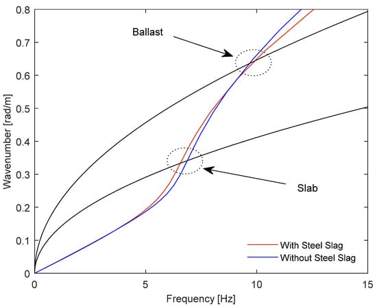 Nevertheless, it is crucial to uncover the reasons behind the varying effects of the steel slag layer on different track types. To address this, an analysis of the dispersion curves for both the railway tracks and the geotechnical profiles was conducted, and the results are depicted in Figure 18. It is worth noting that the critical speed can be estimated by calculating the inverse of the slope of the line connecting the reference origin and the intersection point between the dispersion curve of the railway track and the geotechnical profile []. As shown in Figure 18, the dispersion curves for the soil, with and without steel slag, intersect the dispersion curve of the ballasted track nearly at the same point, resulting in similar critical speeds. However, this pattern does not hold true for the slab track, where a slight deviation leads to a minor change in the critical speed of the profile. Even so, it is essential to emphasize that the reduction in efficiency observed in the slab track is negligible compared to the overall sustainability achieved by employing the steel slag layer.