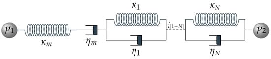 In the GK contact model, the increment in the displacement of the viscoelastic (Kelvin chains) and dashpot () elements is calculated by deriving Equation (1) and further adopted to determine the displacement at time . The displacement associated with the elastic portion derives from the direct relationship between the contact force and the stiffness . The elastic, delayed elastic, and dashpot displacements are, respectively, given by