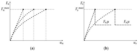 where refers to (contact fracture energy in mode I) if the analysis is in the normal (n) direction or (contact fracture energy in mode II) if the analysis is in the shear (s) direction. The and terms correspond to the area of the softening region in Figure 3 (grey-painted area) for the normal and shear directions. The term is the contact stiffness of the associated Kelvin model. In this study, the contact stiffness assumes the relationship between the adopted spring stiffness of the Maxwell unit and the contact area and contact length of the particle-to-particle contact.