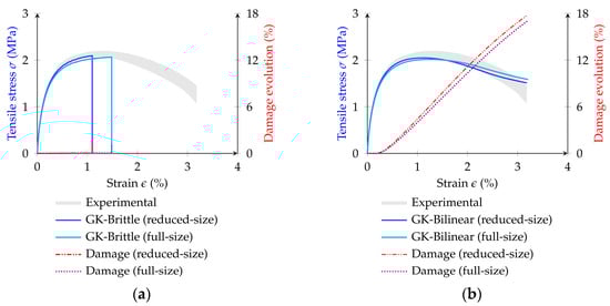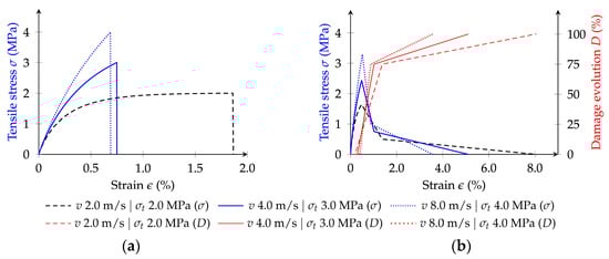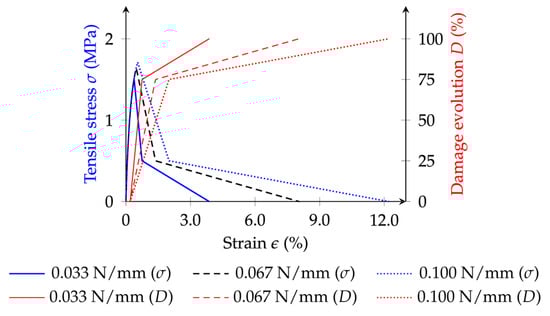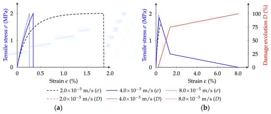 The loading velocity also influences the stress–strain response predicted with the GK-Bilinear model (Figure 6b). Contrary to the response observed with the GK-Brittle model, with the GK-Bilinear model, the peak stress increases with the increase in the applied loading velocity. As shown, the input tensile strength (2.0 MPa) is never reached for the range of velocities. This response is attributed to the displacement-controlled nature of the GK-Bilinear model, wherein the total contact displacement reaches the yield displacement ( in Figure 3a) before reaching the peak load. In addition, at lower loading velocities, the viscous response of the GK-Bilinear contact model is more pronounced. Figure 6b also presents the damage evolution. As shown, the damage evolution is similar for all tested contact velocities, which was expected given that the GK-Bilinear model damage evolution is governed by the total contact displacement.