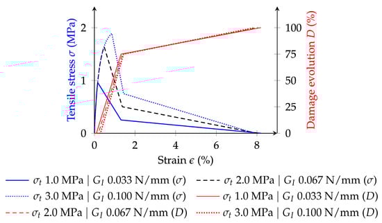 Figure 10 presents the predicted numerical results. The proportional increase in both contact strength parameters leads to an increase in the peak stress and post-peak ductility. These results indicate that proportionally increasing both contact strength parameters offers an interesting option if it is desired to increase both the peak strength and post-ductility of a particle model under uniaxial tensile loading. For a 3.0 MPa maximum contact tensile strength, a more pronounced viscoelastic behaviour before the peak strength value is observed. The effect of a proportional variation of the maximum contact tensile strength and contact fracture energy in mode I does not significantly affect the contact damage evolution.