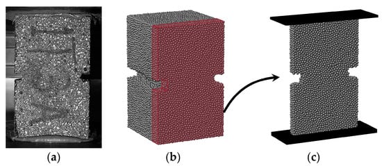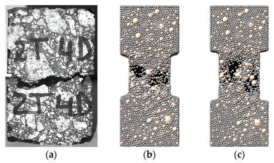 Asphalt mixture specimen after tensile loading: (a) experimental []; (b) Case 1a: GK-Brittle, BRM; (c) Case 4b: GK-Bilinear, BRM.