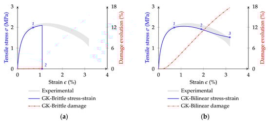 The results presented show some interesting differences in the predictions of the proposed GK damage models. In the GK-Brittle, an increase in the assumed maximum contact tensile strength leads to a more ductile post-peak behaviour, whereas in the GK-Bilinear, an increase in the assumed maximum contact tensile strength leads to a more brittle post-peak behaviour for the same set of viscoelastic contact properties. If the contact fracture energy is held constant in mode I and a higher contact tensile strength are assumed, the GK damage force–displacement is much more brittle as the controlled displacement values are lower compared to the GK damage for lower tensile strength (see Figure 3 and Equations (7)–(9)).