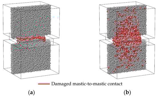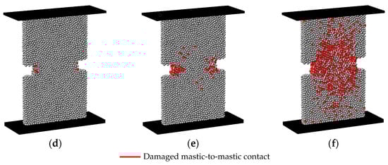 As expected, the main contact damage locations in these case studies are located in the vicinity of the notch tips, confirming its higher susceptibility to damage progression in the asphalt mixture model, primarily due to damage occurring along the aggregate-to-mastic and mastic-to-mastic contacts. Gao et al. [] also suggested that macro-cracks predominantly form at aggregate-to-mastic and mastic-to-mastic contacts in the fracture analysis of asphalt mixtures subjected to three-point bending tests. Dispersed damage occurs outside the volume of influence of the notch tips and in the mid-height of the numerical specimen; however, its impact on the overall specimen damage is minimal. Despite a significant percentage of damaged contacts among adjacent aggregates in Case 1 (using the BRM approach), as indicated in Figure 21a, these damaged contacts are more likely to occur outside the zone between the notch tips of the numerical model, indicating that these damaged contacts do not significantly contribute to the macro-crack formation of the model.