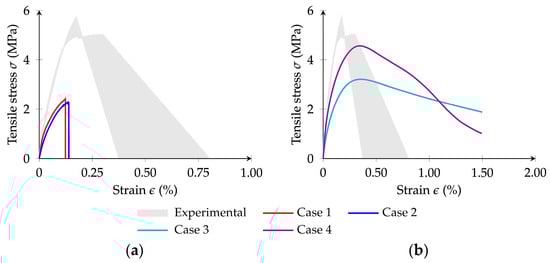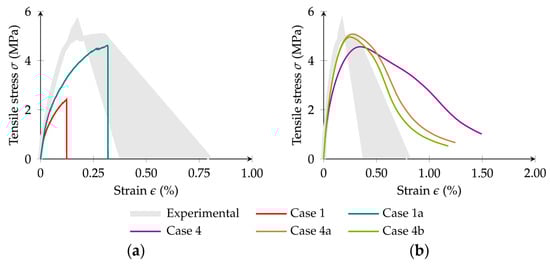 Stress–strain response of an asphalt mixture under tensile loading: (a) GK-Brittle (Cases 1 and 1a); (b) GK-Bilinear (Cases 4, 4a, and 4b).