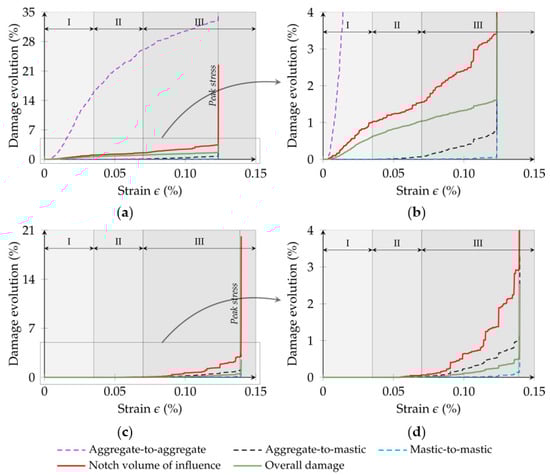 - The evolution of contact damage can be divided into three different stages. Stage I involves mainly damage evolution located between adjacent aggregates (when allowed) as a result of the rearrangement of these elements in the specimen, predominantly occurring outside the notch tips. In Stage II, damage develops in the viscoelastic damage contacts as stress increases, especially around the notch tips. In Stage III, damage may follow a rapid increase (GK-Brittle) or a stabilisation tendency (GK-Bilinear).