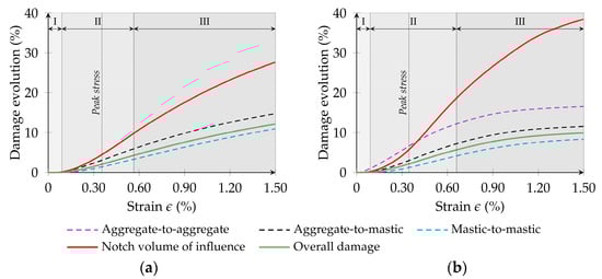 In both GK-Damage models, the contact damage evolution can be divided into three different stages. Initially, in Stage I, no damage is observed in contacts involving mastic elements for all case scenarios. This stage primarily involves damage evolution localised between adjacent aggregates (when allowed) because of the rearrangement of aggregates in the virtual specimen.
