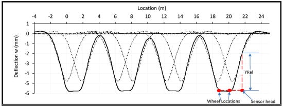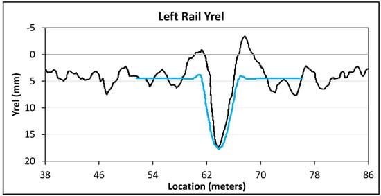 Figure 5, the rail deflection can be modelled using beam on elastic foundation theory, and the modelled YRel value can be calculated from Equation (3) for each measurement location. The rail deflection curves can be converted to YRel plots using the equations presented previously. The YRel map for the mud spot shown is overlaid with a modelled (blue line in