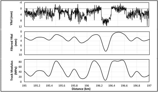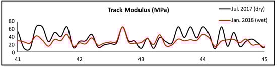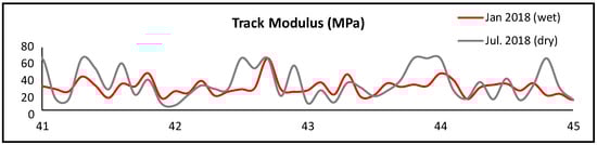 Figure 13 above, the YRel data were evaluated over a length of 20 m and smoothed using a low-pass filter prior to assessing track modulus using Equation (2). The wet cycle clearly shows the variability, as well as the isolated locations of significant deviation. The pattern of variability is evident in that some locations show similar changes between runs, and softer and stiffer sections of track can easily be seen. In addition, the average track modulus for these three cycles, from km 41 to km 45, was 41.3 MPa in Jul. 2017 (dry), 30.8 MPa in Jan. 2018 (wet), and 39.8 MPa in the next dry cycle (Jul. 2018).