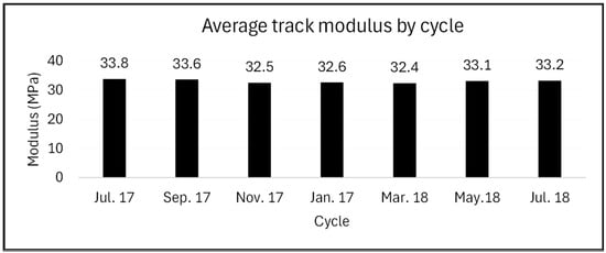 Figure 8 illustrates the average track modulus values, depicted graphically for each observed cycle. These results are aligned with the methodology outlined in the preceding sections of the article, ensuring consistency in the data analysis process. This visualization aids in understanding the variability and trends in the track modulus values across different cycles, providing insights into the structural integrity and performance of the tracks under study.