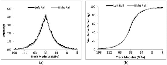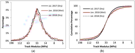 Figure 10a showed (for the left rail) that the average track modulus value is nearly the same for each cycle, approximately 33 MPa, with a deflection of 3 mm. This is as expected, since seasonal effects will not affect the majority of the track, but only a subset. This is seen on the right side “tail” of the distribution, where cycle January 2018 (wet) extends further to the right. This indicates a certain percentage of modulus values larger than the dry cycles’ values. The seasonal effects can be better visualized in a cumulative distribution plot as shown in