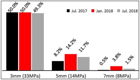 Figure 11 below shows the seasonality effects on track support. It can be seen that all three cycles had approximately 50% of their values near the expected mean of 33 MPa. This indicates they behave the same on average. However, the wet season (January) clearly has more instances of higher YRel values than the dry season results. In particular, nearly 14% of the track has a YRel > 5 mm during the wet season, which correspond to track modulus values of 14 MPa, while only 8.2–11.7% of the track exceeds 5 mm during the dry season. In addition, 3.8% of the track exceeds 7 mm (8 MPa) during the wet season, while during the dry season only 0.5–1.5% of the track exceeds that limit. This macro analysis allows for a global understanding of the seasonal effects.
