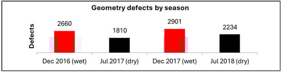 Figure 14 clearly shows the increase of geometry defects during the wet season, which is related to the variation in track stiffness during this period. This fact is associated with changes in subgrade condition due to the moisture variation and the excess of contamination existing in the ballast of most of the studied track sections. Note that the 2018 dry season shows an increased number of defects with is most likely related to the track degradation.