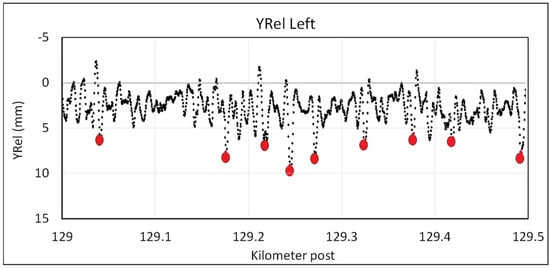 Figure 15 shows a unique YRel signature of the mud spot. The surrounding locations have a mean YRel of 4.3 mm, a peak YRel of 17.8 mm in the center of the mud spot, and an average minimum value of −2.5 mm in the uplift zone. The mud spot YRel map has a length of approximately 5 m in the uplift zone and 4 m at the mean location. Note that this graph depicts the maximum YRel at each measurement location (every meter) as the inspection vehicle moves down the track.