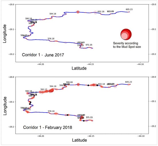 Figure 18 shows the GPS coordinates of identified mud spots in MRS Corridor 1 from June 2017 and February of 2018 (the last measurement in wet season). The figure below clearly shows the evolution of mud spots in this specific corridor by the difference of severity related to the size and the peak of deflection of each mud spot. This location did not receive appropriate substructure maintenance activities during this period of analysis, which facilitated the comparation of seasonal effect and mud spot growth.