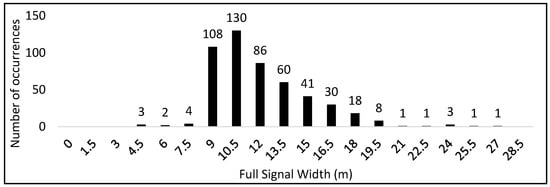 Figure 19. It can be seen that most signals had a total width of between 9 and 18 m. Full width includes the uplift zones and central deflection zone.