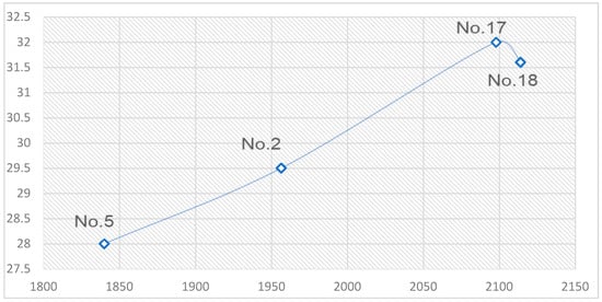 Table 5. To obtain accurate and average values, three specimens were made for each composition. Each test was performed three times, each in accordance with the standards for that test method. The experiment revealed that certain compounds, namely, No. 2, 5 and No. 15 to 20, exhibited higher values of compressive strength. Among the formulations, No. 17 exhibited the most pronounced increase in compressive strength, reaching 31.0 MPa after 28 days. In a comparable manner, formulations No. 2 and No. 18 demonstrated high compressive strength values of 29.5 MPa and 31.6 MPa, respectively.