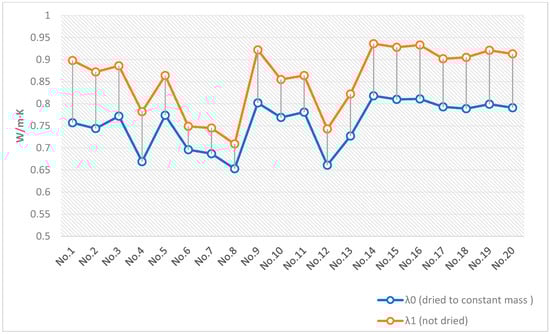 0) of samples dried to constant mass is in the range of 0.661 to 0.757 W/m·K, as indicated in