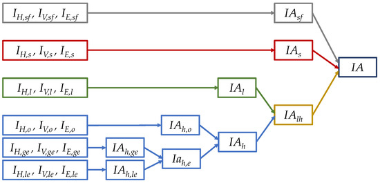 Similar procedures are proposed for the factors of the other risks. The indices IH, IV and IE are then combined to obtain the index of the various risks using Equation (1).
