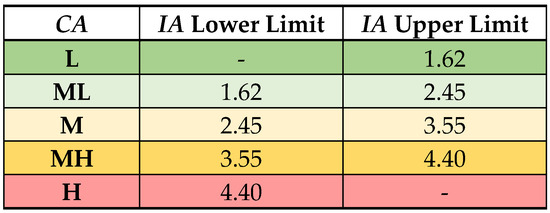 The coefficients of Table 3 and Table 4 have been calibrated with LG2020. Furthermore, for a comparison between the five classes of LG2020 and the values of IA, the range of these values has been divided into five intervals, as shown in Figure 3.