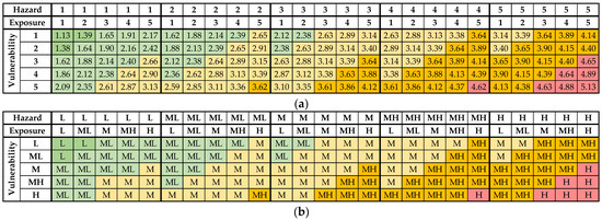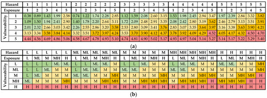 Analogously, in Figure 5a, the index of attention for landslide (IAl) obtained using the coefficients given in Table 3 is shown as a function of the H, V and E indices. The different colors indicate the different classes of attention defined before and are helpful for a comparison with the classification of LG2020, shown in Figure 5b. Only in one case does IAl indicate a class lower by one step with respect to LG2020, but the value of IA is very close to the chosen boundary. It is worth noting that the same value is often present in more than one cell. This occurrence, which reduces the possible numerical outcomes, is related to the procedure used in LG2020, where the same weight is given to both vulnerability and exposure.