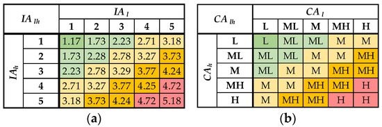 The hydraulic risk index is obtained from Equation (3) and then combined with the landslide risk using Equation (4). As an example, the values of IAlh, obtained for specific values of the IAl and IAh, are reported in Figure 7a. For comparison, the corresponding classes of attention of LG2020 are in Figure 7b.