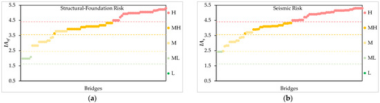 Figure 10b shows the IAh values for all bridges sorted by increasing values and the corresponding CAh of LG2020. Only in five cases do bridges with a medium CAh have a value of IAh that falls within the range corresponding to a medium-high CAh in Figure 3, and only one bridge with medium-high CAh falls within the range associated with a high CAh. Also, for this risk, there are many cases of low CAh. These correspond to the absence of hydraulic risk, for which the value “0” should be considered.