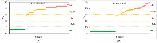 Landslide and hydraulic risks have been combined. Figure 11a shows the IAlh values for all bridges sorted by increasing values and the corresponding CAlh of LG2020. Only in three cases did bridges with a medium-low CAlh have a value of IAlh that falls within the range corresponding to a medium CAlh (Figure 3).