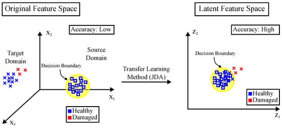 Finally, it is possible to generalize the classifier’s application in the latent feature space, assuming a binary classification (healthy and damaged conditions) and a decision boundary. The classifier’s accuracy is a performance metric highlighting the transfer learning success.