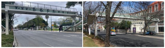 In the Lisbon district of Campo Grande, two similar pedestrian bridges are located 225 m from each other. They are designated herein as the north and south bridges (Figure 2). Both bridges are in front of Lusófona University’s Campus and are characterized by a superstructure consisting of two prefabricated I-shaped beams in reinforced and prestressed concrete, linked by simply supported slabs at the bottom flanges, as shown in Figure 3.